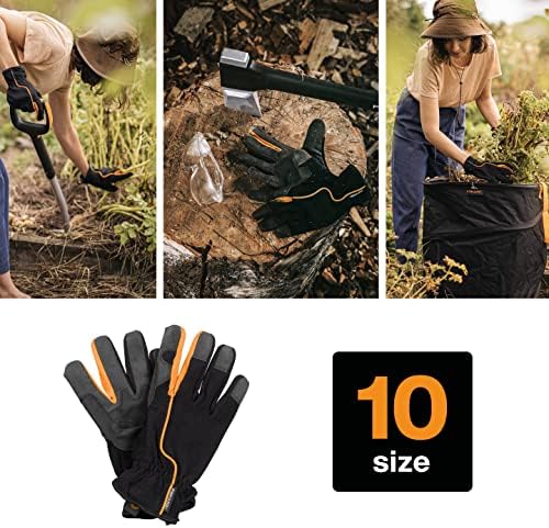 Fiskars Garden Tool Set, 4 Pieces, Xact Brushcutter, Stainless Steel/Plastic, Hoe and Solid Transplanter, FibreComp, Gardening Gloves, Size: 10, Black/Orange, 1077308