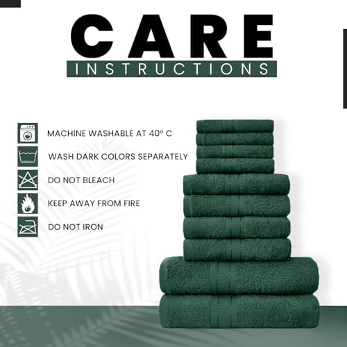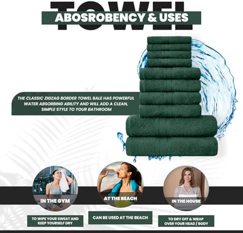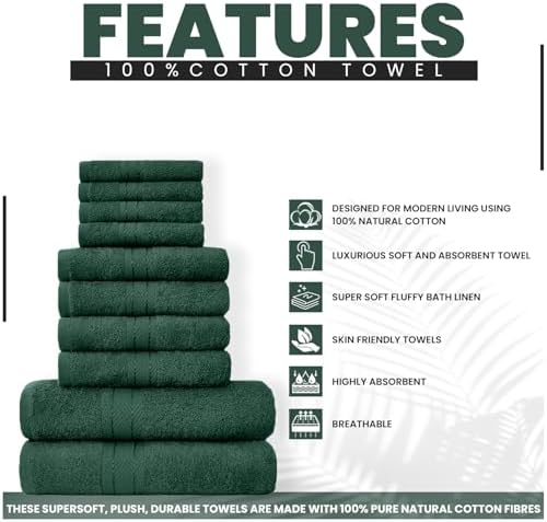 PREMIUM 450GSM TOWEL SET – This dark green bullet set is made of 100% cotton, making the high gsm towel set durable and long lasting. The size of the 10 piece towel set is 4 face towels 30 x 30 cm, 4 hand towels 50 x 80 cm, and 2 bath towels 70 x 120 cm. This 100% Egyptian cotton 450 GSM towel set will add a stunning look to your bathroom.