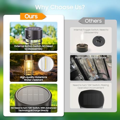 Auto On/Off & Easy Installation The on/off button has been upgraded to the surface of the product for easy access, unlike similar products where it is located under the solar panel. When in use, the solar garden lights outdoor dig into the ground without any wiring or extra batteries. They automatically charge during the day and light up at night, no need for manual operation.