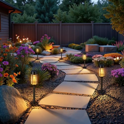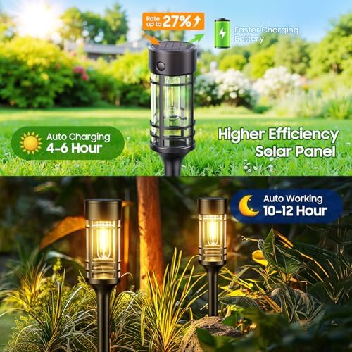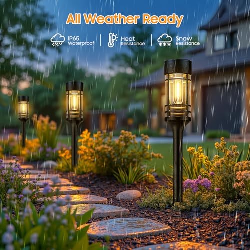 GEARLITE solar garden lights feature high-clarity lamp shades and 2800K tungsten bulbs, emitting a soft, warm glow that creates a peaceful and cozy atmosphere. The high melting point of the tungsten bulb of 3260℃ improves its durability, ensuring a longer life compared to standard solar garden lights. Equipped with advanced monocrystalline silicon solar panels, these lights fully charge in just 4 hours of direct sunlight and provide up to 12 hours of continuous lighting, delivering superior energy efficiency. The easy-to-install design requires no wiring or additional batteries, and the lights automatically charge during the day and light up at night. With an IP65 waterproof rating, they are designed to withstand harsh weather conditions such as rain and snow. This 4-piece set is a perfect gift for garden lovers, ideal for adding charm and warmth to any outdoor space, making it an excellent choice for holidays and special occasions.