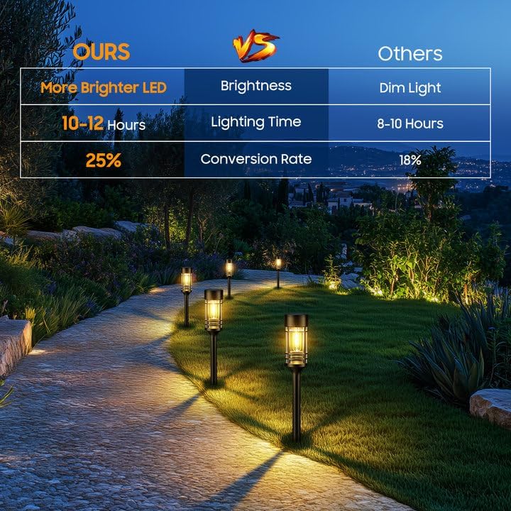 ENERGY SAVING & ECO-FRIENDLY – GEARLITE garden lights are equipped with advanced monocrystalline silicone solar panels with a conversion efficiency of up to 27%. It fully charges in just 4 hours of direct sunlight and provides up to 12 hours of continuous lighting, 1.5 times longer than most similar products. 100% solar energy is energy efficient and environmentally friendly, helping you create a greener home environment.