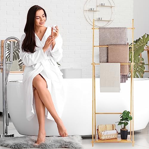 El toallero de pie te permitirá secar las toallas de mano y de baño ahorrando espacio. Podrás colocar el portatoallas con 4 barras en cualquier lugar de la habitación, sin necesidad de taladrar. Coloca tus toallas y paños en el colgador de toallas o utilízalo como organizador de ropa en el dormitorio. La balda es perfecta para las toallas limpias, el papel higiénico o los zapatos. Cuando no lo utilices, podrás plegar los estantes del soporte de toallas para ahorrar espacio.