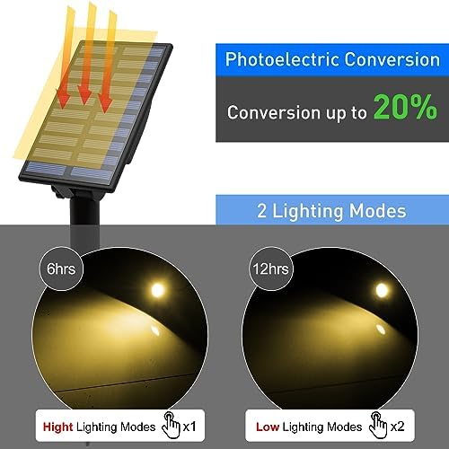 🌈【2 Modes to Choose】 Solar garden lights can freely choose the high and low light lighting mode. Charging time 8-10 hours, range 10-14 hours.